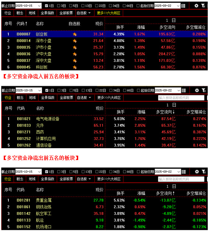 从板块资金动向数据来看,截止到今日收盘时,在资金流入榜上,电气电源设备板块以87.54亿的资金流入额位居榜首;其次是元件板块,资金流入65.37亿;此外,西药板块、计算机应用板块、通信设备板块也都相继上榜,三个板块的资金流入额分别为45.69亿、42.19亿、39.47亿;再看资金流出榜,贵重金属板块引领做空,资金流出13.07亿;其次是钢铁冶炼板块,资金流出9.20亿;此外,航空军工板块、航运板块机场港口板块的资金流出额也都相对较多,分列资金流出榜第三到第五名位置。综合比较后可知,今日不仅电气电源设备板块资金流入高达87亿,元件、西药、计算机应用、通信设备等板块的资金流入额也都在39亿之上,场内多方人气快速回升,全天资金流入超过10亿的板块多达20个;反观空方阵营,只有贵重金属板块资金流出超过10亿,整体抛压明显减弱。六大战区的情况分别来看,截止到今日收盘时,六个战区均为资金流入状态,其中不仅创业板战区与深中大盘战区资金流入双双超过170亿,沪中大盘战区的资金流入额更是高达204亿。可见今日多方全面发力,各战区均有资金大幅回流,抢筹迹象较为明显,说明尽管前几日空方力量较强,但市场并未形成持续性恐慌,所以只要行情出现企稳回升,就会有资金快速进场。在这种情况下,行情下方的基础就会越来越牢固,后市则有望继续上攻。建议大家控制好仓位,同时可关注前期调整较为充分且近期有资金连续回流的个股,逢低吸纳。