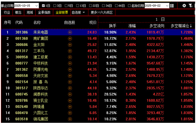 【今日多空资金增仓前200名中涨幅最小的15只个股】