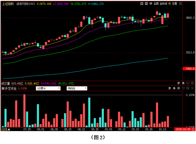 再看图2,今日大盘不仅很快收复了5日成本均线,而且指数还重新跃上了3900点整数关口。从收盘位置看,昨日的阴线实体已经被完全吞没,市场短期走势依然维持在强势格局当中,接下来只要多方后续力量能够不断跟上,行情就有望向上创出新高。从下方的多空资金来看,今日多空资金为流入状态,且资金流入量大于昨日,说明尽管近期市场出现较大波动,但资金不仅没有出逃,反而在逢低连续加仓。在这种情况下,行情自身就具备了更为强劲的上攻动能,所以接下来若大盘向上创出新高,市场很可能会向4000大关发起冲击。建议大家在控制好仓位的同时,一方面要密切关注场内多空资金的进出情况,只要空方无法连续施压,面对震荡,就不必过于恐慌;另一方面则可积极优选个股,锁定目标,跟踪观察,并逢低逐步吸纳。