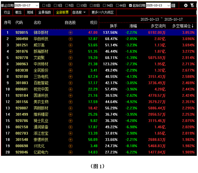 【10月13日至10月17日多空资金增仓前300名中涨幅最小的20只个股】