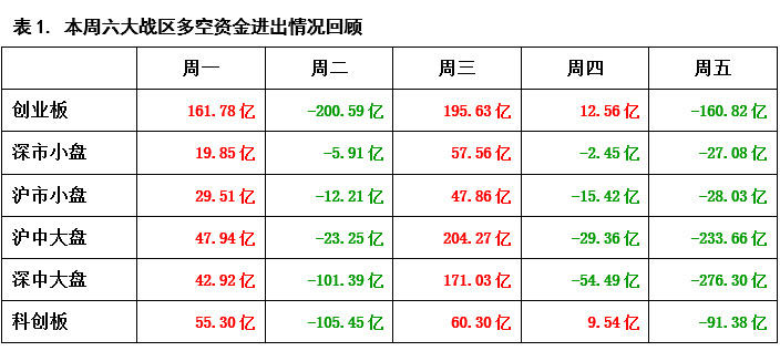 从表1的每日六大战区多空资金进出情况中可以看到,虽然在本周一的行情中,多方资金全面进场,但周二多方的后续力量并没有及时跟上,空方趁机施压,六大战区均出现了资金大幅出逃,其中不仅深中大盘战区与科创板战区当天资金流出双双超过百亿,创业板战区的资金流出额更是高达200亿;好在周三多方强力反击,及时遏制住了市场连续杀跌,不过通过与周二各战区的资金流出额相比可以发现,创业板战区与科创板战区的资金回流量都没有完全覆盖掉周二的资金流出额,所以市场中的做多信心还是受到了打击;也正因如此,周四与周五,多方都未能再次取得优势,资金不仅连续两天以流出为主,而且抛压还有持续增强的迹象,意味着行情尚未企稳,后市调整仍会持续。