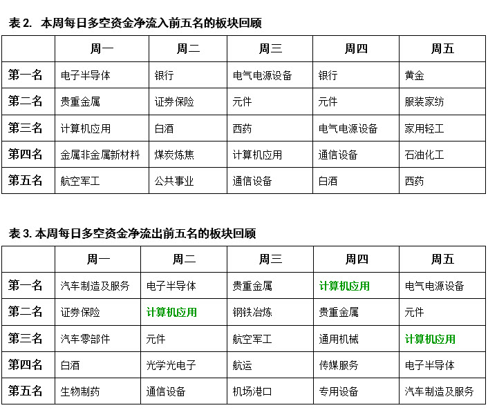 从表3的每日资金流出排行榜前五名来看,本周做空较为积极的是计算机应用板块,该板块在本周五个交易日内三度出现在资金流出榜前五名之内。计算机应用板块向来都是科技类板块的典型代表,具有极强的人气号召力。该板块的连续杀跌不仅带动其它科技类板块纷纷出现回调,场内多方人气也随之出现持续下降。所以在计算机应用板块尚未重新转强之前,多数中小盘科技股的调整很可能还会持续。