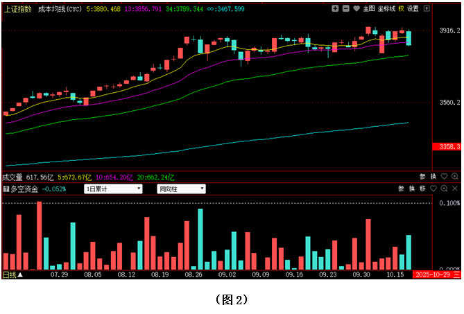 从图2中可以看到,本周一大盘虽大幅低开,但当天就出现强劲回升,到收盘时,指数不仅重新站上了5日成本均线,而且早间的向下跳空缺口也几乎被完全回补;周二多方冲击3900点未果,指数高开低走,收出阴线;不过周三行情并未持续回落,反而再次上攻,指数也站到了3900点整数关口上方;周四大盘曾试图向上突破10月9日的3936高点,盘中指数一度摸至3930点上方,然而面对近在咫尺的前期高点,多方却犹豫了;结果周五行情大幅回落,不仅3900点整数关口得而复失,而且指数还连续击穿了5日与13日两条重要成本均线。从下方的多空资金运行情况来看,虽然本周一到周三资金均为流入状态,但资金流入力度并不是很大;周四与周五空方则连续施压,且周五的资金流出量明显增多。所以就全周而言,空方反而略占优势。在这种情况下,下周初市场很可能会有惯性下探的动作。建议大家控制好仓位,同时密切关注3800点整数关口与34日成本均线这两个重要支撑位置,若行情在3800点整数关口或34日成本均线附近出现止跌,且资金快速回流,后市则有望迎来反弹;反之,如果3800点整数关口与34日成本均线相继失守,则表明后市会有更大的幅度的调整。