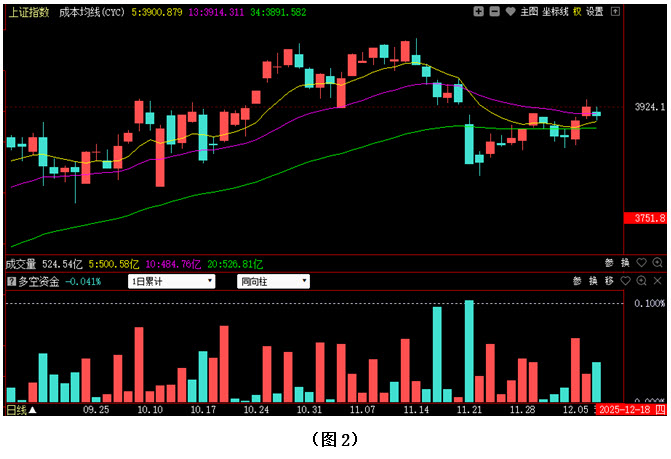 再看图2,今日大盘低开低走,收出阴线,指数也随之重新回落到13日成本均线下方。好在市场下方仍有5日成本均线、3900点整数关口、以及34日成本均线等多道支撑,所以只要多方及时发力反击,后市就仍有继续向上回升的可能。从下方的多空资金来看,今日多空资金为流出状态,且资金流出量超过了昨日的资金流入量,说明在关键位置,举棋不定的投资者数量依然较多,所以行情稍有回探,场内抛盘就会快速涌出。在这种情况下,如果接下来多方无法及时反击,任由抛压不断增大,大盘很有可能会再次跌破5日成本均线,甚至重新回落到34日成本均线下方。故此建议大家在控制好仓位的同时,密切关注多空资金的进出情况以及3900点一带的支撑情况,若多方很快发力,指数牢牢站稳在13日成本均线上方,后市就有继续向上拉升的可能,投资者则可跟随资金步伐,及时优选个股,加仓做多;反之,操作上则需以谨慎为主。