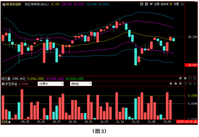 今日两市上涨个股共1308只,其中涨幅超过3%的个股299只,涨幅在9.9%以上的个股62只;下跌个股共4058只,其中跌幅超过3%的个股436只,跌幅在9.9%以上的个股10只。图3所示为指南针特有的0Z指数K线图,从图中可以看到,今日0Z指数同样低开回落,收出阴线,收盘位置也随之再次回到优化布林中轨下方。可见今日场内多数个股都出现了回探,导致刚刚有所转强的市场整体走势面临着重新转弱的危险。从下方的多空资金来看,今日多空资金为流入状态,但资金流入量很小,说明由于行情在关键位置出现反复,很多本是有进场意愿的投资者立刻停止了买入,转为采取观望态度。在这种情况下,如果市场很快继续选择上攻,投资者的做多热情就依然会维持在较高水平,资金仍会以进场为主;反之,若行情连续回落,就会有更多场外投资者选择观望,从而导致多方后续力量不足,调整还会继续。