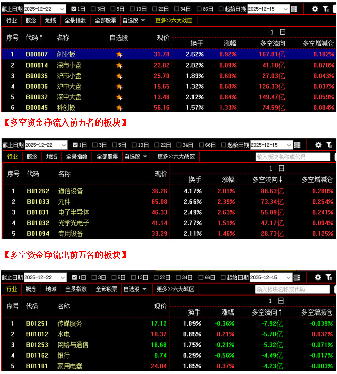 从板块资金动向数据来看,截止到今日午间收盘时,在资金流入榜上,通信设备板块以88.63亿的资金流入额位居榜首;其次是元件板块,资金流入73.34亿;此外,电子半导体板块、光学光电子板块、专用设备板块也都相继上榜,三个板块的资金流入额分别为55.89亿、47.17亿、28.73亿;再看资金流出榜,传媒服务板块引领做空,资金流出7.92亿;其次是水电板块,资金流出5.70亿;此外,网络与通信板块、银行板块、家用电器板块的资金流出额也都相对较多,分列资金流出榜第三到第五名位置。综合比较后可知,今日上午不仅通信设备板块资金流入高达88亿,元件、电子半导体、光学光电子等板块的资金流入额也都在45亿之上,科技类板块的再度群体上攻令场内多方人气进一步提升,仅半天时间,资金流入超过10亿的板块就多达18个;反观空方阵营,各板块的资金流出额均不足8亿,整体抛压较小。可见今日上午多方力量明显强于空方,资金继续以流入为主。在这种情况下,场内上攻动力就依然十分充足,所以行情很难突然出现连续大幅下挫,后市有望在资金的推动下继续向上回升。建议大家可在控制好仓位的同时,关注近期有资金连续加仓且短期趋势保持向上的优质个股,逢低介入。