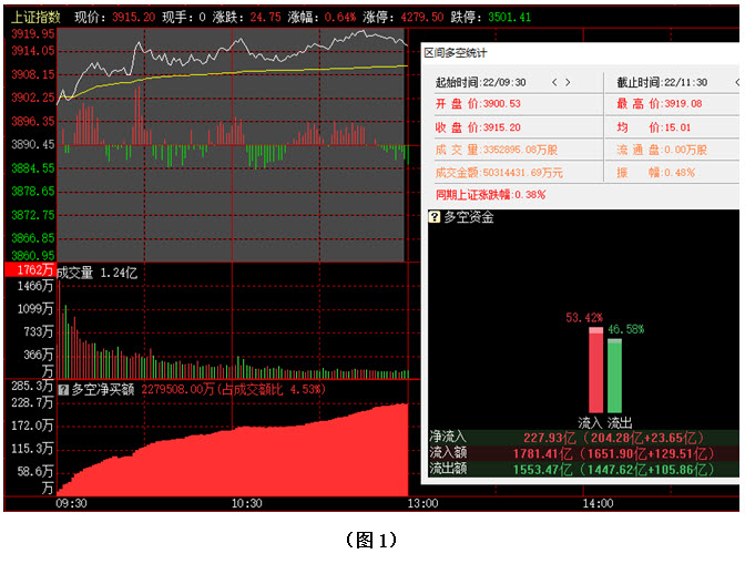 今日早间大盘直接高开在3900点整数关口上方,随后市场逐步震荡上行,至中午收盘时,指数位于3915点。从日K线图上看,今天上午大盘不仅以高开方式一举跃过3900点整数关口与13日成本均线两道阻力,并继续向上攀升,市场短期走势明显好转。从下方的多空资金来看,早间开盘后,多方就占据优势,随后资金持续流入。截止到中午收盘时,沪市当中多方力量高于空方超过6个百分点,资金流入220多亿。从六大战区的情况分别来看,截止到今日中午收盘时,六个战区均为资金流入状态,且创业板战区、沪中大盘战区、以及深中大盘战区的资金流入额都超过了125亿。可见今日上午资金积极进场加仓,多方力量远远强于空方,促使投资者的做多热情不断提升。在这种情况下,行情在短期内就很难出现连续大幅杀跌。目前指数正逐步向12月8日的高点逼近,若能成功突破该高点,后市上涨空间就会进一步打开,但如果大盘在12月8日高点附近遇阻,并再次回落,那么则意味着市场很可能会在3816点至3936点之间形成一个新的箱体结构,后市若多方力量减弱,空方趁机施压,箱体下沿则会面临再次考验。建议大家不要在大盘接近3936点时追涨,以免市场未能形成突破,被套在短期高位。