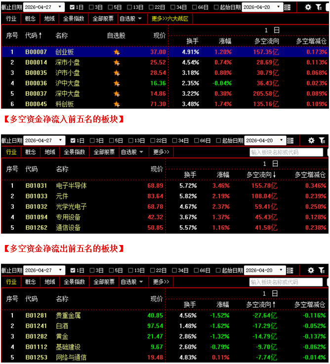 从板块资金动向数据来看,截止到今日收盘时,在资金流入榜上,电子半导体板块以155.78亿的资金流入额位居榜首;其次是元件板块,资金流入108.04亿;此外,光学光电子板块、专用设备板块、通信设备板块也都相继上榜,三个板块的资金流入额分别为59.41亿、45.43亿、41.58亿;再看资金流出榜,贵重金属板块引领做空,资金流出27.64亿;其次是白酒板块,资金流出17.29亿;此外,黄金板块、基础建设板块、网络与通信板块的资金流出额也都相对较多,分列资金流出榜第三到第五名位置。综合比较后可知,今日上午不仅电子半导体板块与元件板块资金流入双双超过108亿,光学光电子、专用设备、通信设备等板块的资金流入额也都在40亿之上,带动场内多方人气明显回升,全天资金流入超过10亿的板块达到16个;反观空方阵营,虽然贵重金属板块资金流出超过25亿,同时白酒板块与黄金板块的资金流出额也都在10亿之上,但与多方力量相比,整体抛压并不是很大。从六大战区的情况分别来看,截止到今日收盘时,六个战区均为资金流入状态,其中不仅创业板战区与科创板战区资金流入双双超过135亿,深中大盘战区的资金流入额更是高达205亿。可见今日多方全面发力,各战区均有资金积极进场加仓,尤其是近期表现较强的中小盘科技类个股,更是成为资金重点抢筹的对象,从而呈现出一种“强者恒强”的特征,有效的激发起了短线投资者的追涨热情。在这种情况下,若无突发事件影响,行情出现连续大幅杀跌的可能性很小。接下来大家可在控制好仓位的同时,密切关注场内多空资金的进出变化,只要多方后续力量能够不断跟上,市场就有望延续现有趋势,震荡上行,操作上则可继续以看多做多为主。