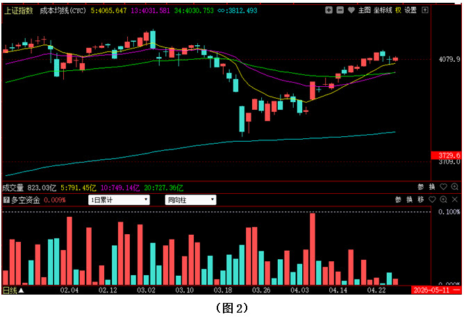 再看图2,今日大盘略有回升,最终小幅收阳。虽然收盘在4100点整数关口下方,但指数依然完全运行在5日成本均线之上,可见市场短期走势仍处于强势格局当中,接下来只要多方后续力量不断跟上,行情就有望依托着5日成本均线继续震荡上行。从下方的多空资金来看,今日多空资金为流入状态,但资金流入量却小于上周五的资金流出量,说明多方尚未将上周五的抛压完全化解,所以若接下来多方无法快速夺回4100点整数关口,行情很可能还会在4100点下方继续震荡整理。建议大家在控制好仓位的同时,密切关注5日成本均线对大盘的支撑情况以及场内多空资金的进出变化,若多方后续无力,空方再次施压,导致指数轻松跌破5日成本均线,则不要急于重仓抄底。