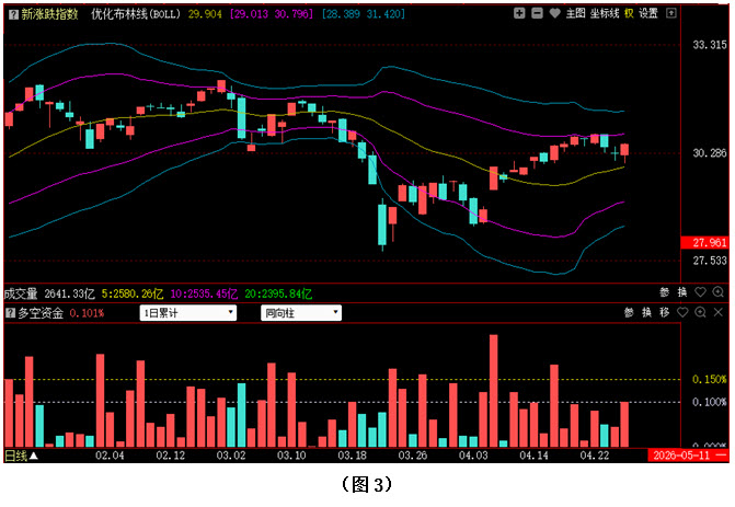 今日两市上涨个股共3182只,其中涨幅超过3%的个股873只,涨幅在9.9%以上的个股109只;下跌个股共1900只,其中跌幅超过3%的个股376只,跌幅在9.9%以上的个股48只。图3所示为指南针特有的0Z指数K线图,从图中可以看到,今日0Z指数同样出现回升,最终以阳线报收。可见今日场内多数个股都有所上涨,0Z指数优化布林中轨进一步上移,市场整体走势依然较强。从下方的多空资金来看,今天多空资金为流入状态,且资金流入量较上周五有明显放大,说明多方不仅连续发力,且资金进场的力度也在进一步增大。在这种情况下,行情出现连续大幅杀跌的可能性较小,接下来0Z指数或有继续上攻的可能。建议大家在控制仓位的同时,关注近期有资金连续加仓的个股,跟踪观察,逢低吸纳。