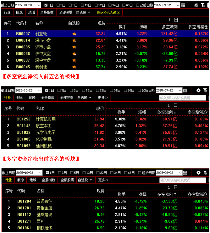 从板块资金动向数据来看,截止到今日收盘时,在资金流入榜上,计算机应用板块以60.57亿的资金流入额位居榜首;其次是航空军工板块,资金流入37.75亿;此外,光学光电子板块、化学制品板块、通用机械板块也都相继上榜,三个板块的资金流入额分别为25.63亿、21.93亿、19.51亿;再看资金流出榜,普通有色板块引领做空,资金流出37.38亿;其次是贵重金属板块,资金流出23.70亿;此外,基础建设板块、西药板块、钢铁冶炼板块的资金流出额也都相对较多,分列资金流出榜第三到第五名位置。综合比较后可知,今日不仅计算机应用板块资金流入超过60亿,航空军工、光学光电子、化学制品等板块的资金流入额也都在20亿之上,场内热点依然较多,多方人气继续维持在较高水平;反观空方阵营,虽然普通有色板块资金流出超过35亿,同时基建、钢铁等权重板块也相继出现在资金流出榜前列,对大盘形成一定压制,但与多方力量相比,整体抛压并不是很大。从六大战区的情况分别来看,截止到今日收盘时,沪中大盘战区与深中大盘战区均为资金流出状态,且沪中大盘战区资金流出超过35亿;其余四个战区则均为资金流入,其中不仅科创板战区与深市小盘战区资金流入双双超过25亿,创业板战区的资金流入额更是高达131亿。可见今日整体上看多方力量仍明显强于空方,资金继续以流入为主。说明虽然大盘在冲过4000点后遇阻回落,但并没有引发大规模恐慌性出逃,目前多数投资者对后市依然较为看好,继续做多的意愿仍相对较强。在这种情况下,行情突然出现连续大幅杀跌的可能性较小,预计接下来多空双方将围绕着4000点展开反复争夺,场内热点的轮动速度也将会随之加快。建议大家注意控制好仓位,不要盲目追涨杀跌,可关注前期调整较为充分且近期股价短期趋势刚刚重新转强的的个股,逢低吸纳。