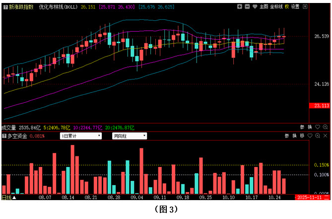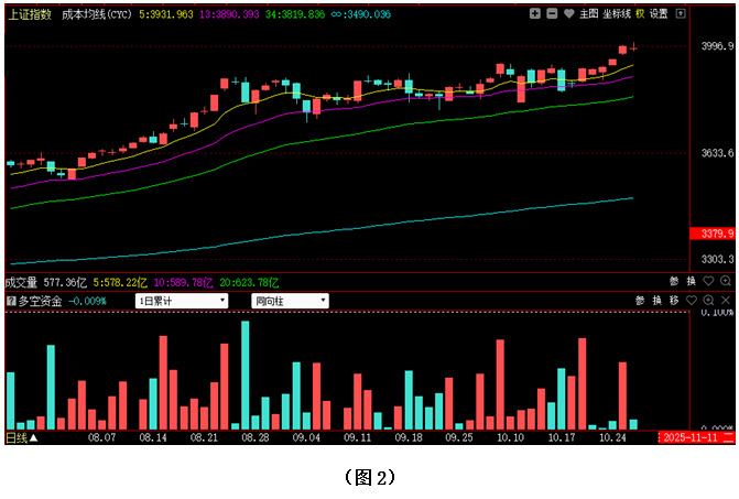 再看图2,今日大盘一度冲至4000点上方,虽没有站稳,指数遇阻回落,但最终收盘位置依然明显高于5日成本均线,可见市场短期走势仍处于强势格局当中,只要空方无法连续施压,后市行情就有进一步上行的可能。从下方的多空资金来看,今日多空资金为流出状态,不过资金流出量远远小于昨日的资金流入量,所以空方虽在试图施压,但还无法改变市场逐步上行的趋势。在这种情况下,多空双方很可能会在4000点展开激烈争夺。建议大家控制好仓位,同时密切关注场内多空资金的进出情况以及5日成本均线对大盘的支撑情况,如果多方后续力量十分充足,大盘就有望逐步站稳4000点上方,并继续向上拉升;反之,若是多方后续力量不足,空方连续施压,导致大盘跌破5日成本均线,市场短期运行趋势就有面临转弱的危险。