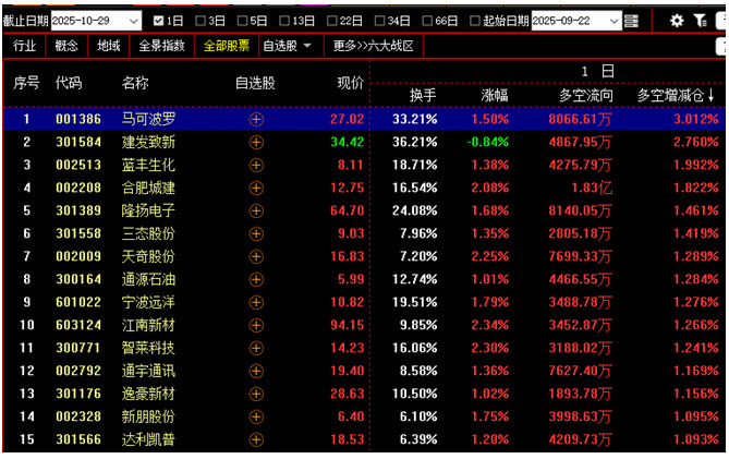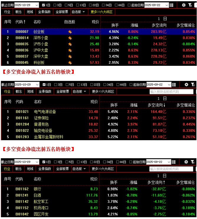 从板块资金动向数据来看,截止到今日收盘时,在资金流入榜上,电气电源设备板块以164.48亿的资金流入额位居榜首;其次是证券保险板块,资金流入91.51亿;此外,普通有色板块输变电设备板块、金属非金属新材料板块也都相继上榜,三个板块的资金流入额分别为81.07亿、73.10亿、51.18亿;再看资金流出榜,银行板块引领做空,资金流出32.87亿;其次是白酒板块,资金流出11.69亿;此外,航空军工板块、机场港口板块、园区开发板块的资金流出额也都相对较多,分列资金流出榜第三到第五名位置。综合比较后可知,今日不仅证券保险板块与普通有色板块资金流入双双超过80亿,对大盘上行起到推动作用,电气电源设备板块的资金流入额更是高达164亿,同时输变电设备、金属非金属新材料等板块的资金流入额也都在50亿之上,场内热点不断涌现,多方人气继续维持在较高水平,全天资金流入超过10亿的板块多达19个;反观空方阵营,虽然银行板块资金流出超过30亿,同时白酒板块的资金流出额也都在10亿之上,但与多方力量相比,整体抛压仍相对较小。从六大战区的情况分别来看,截止到今日收盘时,六个战区均为资金流入状态,其中不仅创业板战区与深中大盘战区资金流入双双超过200亿,沪中大盘战区的资金流入额更是高达278亿。可见今日各战区都有资金持续进场加仓,且力度依然较强,多方力量继续占据着压倒性优势,说明虽然大盘在4000点附近有所反复,但投资者的做多热情依然较高。在这种情况下,场内的抛压就会被多方快速化解,行情出现连续大幅杀跌的可能性明显降低,后市则有望在资金的推动下继续向上震荡攀升建议大家在控制好仓位的同时,可关注近期有资金连续流入且股价短期趋势刚刚重新转强的的个股,择机逢低吸纳