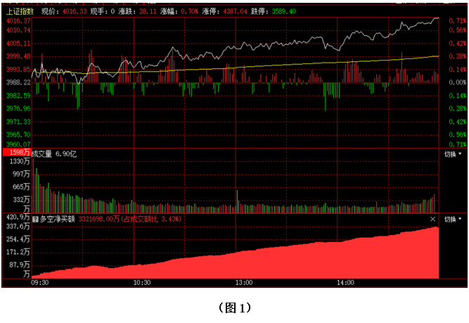 如图1所示,今日早间大盘先是在3990点附近窄幅震荡,10点半后市场开始逐步向上拉升,指数再次跃过4000点整数关口,午后大盘一直保持在4000点上方,并继续缓步上扬,最终以4016点收盘。从下方的多空资金来看,早间开盘后,多方就占据优势,随后资金持续流入。可见今日场外资金积极进场加仓,多方上攻十分坚决,投资者的做多信心也随之得到进一步提升。在这种氛围下,行情就有望站稳在4000点上方,并继续向上拓展空间。建议大家把握好市场节奏,紧跟资金步伐,寻找热点群体中的优质个股,择机介入。