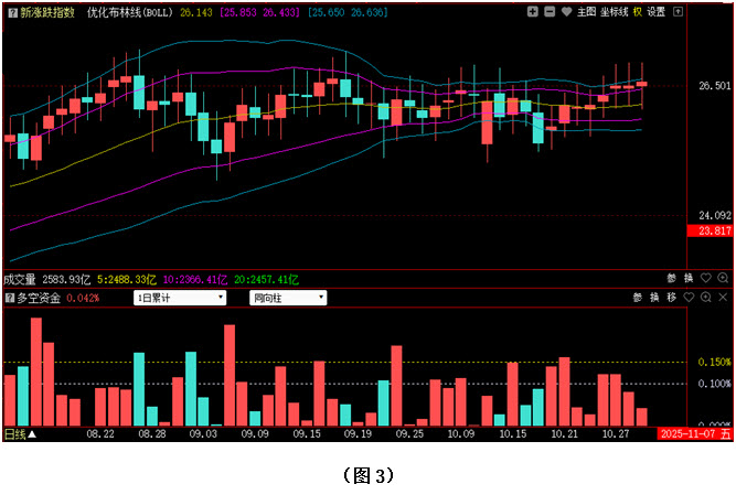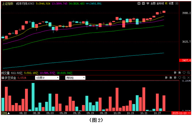 再看图2,今日大盘继续向上攀升,最终以阳线报收。虽然全天涨幅不大,但指数不仅重新跃上了4000点整数关口,而且还再次创出了本轮行情的新高,可见市场短期走势仍处于强势格局当中,后市或有进一步上扬的可能。从下方的多空资金来看,今日多空资金为流入状态,且资金流入量明显超过昨日的资金流出量,说明昨日的抛压已被多方快速化解,并有更多场外资金加入到了做多行列在这种情况下,行情下方基础就会逐渐夯实,后市则有望在资金的推动下继续向上拓展空间。建议大家密切关注场内多空资金的进出情况以及5日成本均线对大盘的支撑情况,如果多方后续力量依然十分充足,大盘稳步运行在5日成本均线上方,就可坚定持股,继续看多;反之,若是多方后续力量不足,空方连续施压,导致大盘跌破5日成本均线,则需及时降低仓位,谨慎操作。