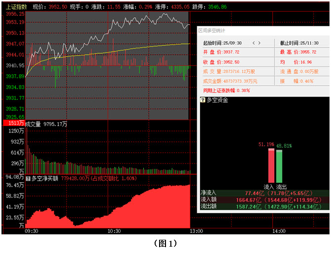 今日早间大盘虽小幅低开,但市场并未趁势回探,而是继续震荡上行,至中午收盘时,指数位于3952点。从日K线图上看,今天上午大盘稳步上行,指数不仅完全运行在5日成本均线上方,而且5日成本均线也有上穿13日成本均线形成金叉的迹象,市场短期强势格局明显,所以不排除行情在2025年年末会有再冲4000点大关的可能。从下方的多空资金来看,早间开盘后,多方就占据优势,随后资金逐步流入。截止到中午收盘时,沪市当中多方力量高于空方超过两个百分点,资金流入70多亿。从六大战区的情况分别来看,截止到今日中午收盘时,六个战区均为资金流入状态,且深市小盘战区、沪中大盘战区、以及深中大盘战区的资金流入额都超过了30亿。可见今日上午多方仍在全面发力,各战区均有资金持续进场加仓。在这种情况下,投资者的做多热情就会持续在较高水平,所以即便行情短期出现回探动作,向下的空间也将较为有限。建议大家可在控制好仓位的同时,积极优选个股,跟踪观察,待市场出现震荡反复时,逢低逐步吸纳。