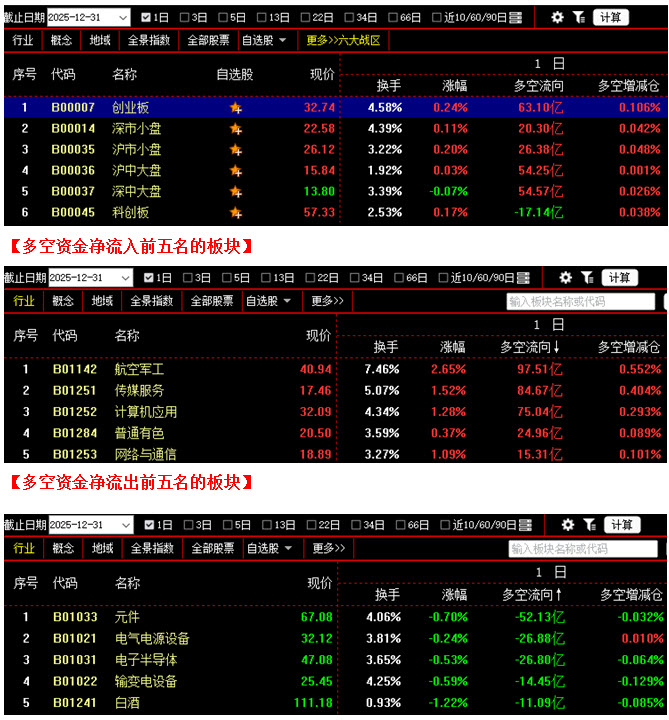 从板块资金动向数据来看,截止到今日收盘时,在资金流入榜上,航空军工板块以97.51亿的资金流入额位居榜首;其次是传媒服务板块,资金流入84.67亿;此外,计算机应用板块、普通有色板块、网络与通信板块也都相继上榜,三个板块的资金流入额分别为75.04亿、24.96亿、15.31亿;再看资金流出榜,元件板块引领做空,资金流出52.13亿;其次是电气电源设备板块,资金流出26.88亿;此外,电子半导体板块、输变电设备板块、白酒板块的资金流出额也都相对较多,分列资金流出榜第三到第五名位置。综合比较后可知,今日不仅航空军工板块资金流入高达97亿,传媒服务板块与计算机应用板块的资金流入额也都在75亿之上,场内热点不断涌现,多方人气继续维持在较高水平;但空方也不示弱,除元件板块资金流出超过50亿之外,、电子半导体板块与电气电源设备板块的资金流出额也都超过了25亿,整体抛压较昨日有所增强。从六大战区的情况分别来看,截止到今日收盘时,只有科创板战区有17.14亿资金流出,其余五个战区均为资金流入状态,其中不仅沪中大盘战区与深中大盘战区资金流入双双超过50亿,创业板战区的资金流入额更是达到63亿。可见今日空方虽试图施压,但整体上多方力量还是明显强于空方,资金继续以流入为主。在这种情况下,行情突然出现连续大幅杀跌的可能性较小,市场在经过短期震荡整固之后,2026年将仍有望继续向上攀升。建议大家可在控制好仓位的同时,关注近期有资金连续加仓且短期趋势保持向上的优质个股,逢低逐步介入。