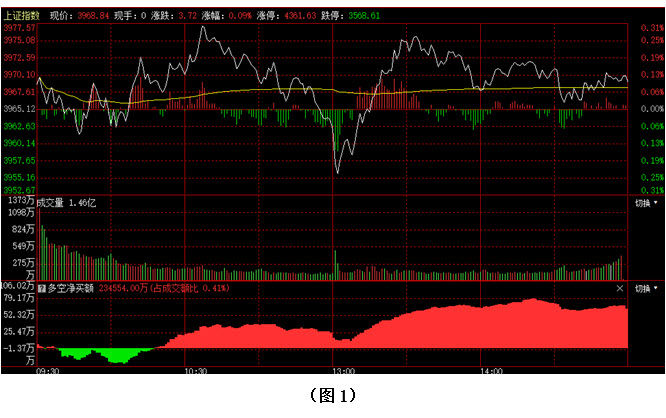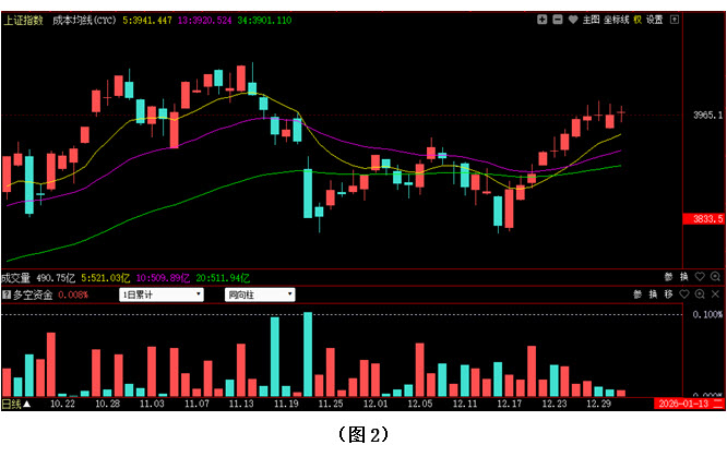 如图1所示,今日早间大盘小幅高开,指数略作回探后出现一波快速上攻,但临近3980点时,上方压力再度显现,导致市场遇阻回落,好在大盘并未持续杀跌,午后指数快速回升至3970点上方,尽管依然未能持续上攻,但再次遇阻后回落幅度明显减小,最终以3968点收盘。从下方的多空资金来看,早间开盘后,多方率先占据优势,虽然盘中由于空方施压,资金出现翻绿,但多方并没有放弃,随着大盘上攻,资金重新翻红并不断流入。可见今日资金仍是以进场为主,多方力量依然强于空方,所以尽管行情还无法冲破3980点附近的阻力,但随着市场下方基础的逐步夯实,不排除大盘在2026年初有再次登上4000点的可能。建议大家可在控制好仓位的同时,积极优选个股,并利用行情震荡,逢低逐步吸纳。