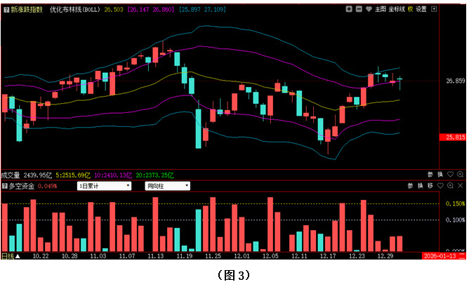 今日两市上涨个股共2474只,其中涨幅超过3%的个股434只,涨幅在9.9%以上的个股78只;下跌个股共2776只,其中跌幅超过3%的个股322只,跌幅在9.9%以上的个股14只。图3所示为指南针特有的0Z指数K线图,从图中可以看到,今日0Z指数继续在优化布林上紫线附近震荡整理,最终小幅收阴。可见今日场内多数个股既没有大幅上涨,也没有大幅回落,市场整体运行较为平稳,强势格局依然没有改变,所以只要多方继续发力,后市就有进一步向上拉升的可能。从下方的多空资金来看,今日多空资金为流入状态,资金流入量与昨日基本持平,说明多方动能仍在不断增强。在这种情况下,近几日0Z指数对12月8日高点的回抽过程就有可能会接近尾声,接下来一旦多方加大进场力度,2026年就有可能迎来开门红行情。