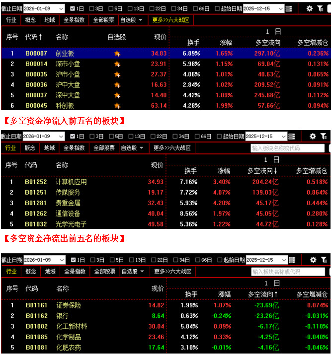 从板块资金动向数据来看,截止到今日收盘时,在资金流入榜上,计算机应用板块以204.24亿的资金流入额位居榜首;其次是传媒服务板块,资金流入139.03亿;此外,贵重金属板块、通信设备板块、光学光电子板块也都相继上榜,三个板块的资金流入额分别为45.17亿、45.05亿、44.72亿;再看资金流出榜,证券保险板块引领做空,资金流出23.69亿;其次是银行板块,资金流出23.26亿;此外,化工新材料板块、化学制品板块、化肥农药板块的资金流出额也都相对较多,分列资金流出榜第三到第五名位置。综合比较后可知,今日不仅计算机应用板块资金流入高达204亿,传媒服务板块的资金流入额也接近140亿,在它们的带领下,贵重金属、通信设备、光学光电子等其他板块纷纷大幅做多,多方人气进一步提升,全天资金流入超过10亿的板块多达21个;反观空方阵营,虽然证券保险、银行两大金融权重板块资金流出均超过了20亿,但与多方力量相比,整体抛压依然较小,所以只能对大盘上涨速度起到减缓作用,却无法令指数出现回落。从六大战区的情况分别来看,截止到今日收盘时,六个战区均为资金流入状态,且创业板战区、沪中大盘战区、以及深中大盘战区的资金流入额均超过了200亿。可见今日资金进场依然十分积极,多方力量依然具备压倒性优势。在这种情况下,行情自然难以无法出现回落,大盘继续向上飙升,指数突破4100点整数关口。建议大家紧跟资金步伐,积极优选个股,择机介入。