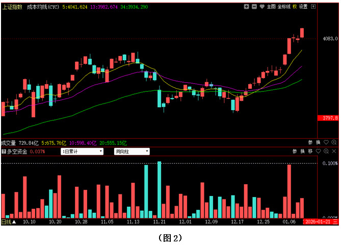再看图2,经过前两日的震荡整理之后,今日大盘继续向上拉升,再收一根阳线。指数也随之突破了4100点整数关口,创出本轮行情的新高,可见市场短期走势依然十分强劲,后市或有进一步上攻的可能。从下方的多空资金来看,今日多空资金为流入状态,且资金流入量继续放大,说明尽管行情从12月17日至今已连续拉升了300点,但投资者的做多热情依然丝毫没有减弱,资金仍在积极进场加仓。在这种情况下,行情在短期内恐怕很难出现连续大幅回落。不过需要注意的是,大盘已经连收16根阳线,开出阴线的可能性正越来越大,所以大家不要因指数连续上涨就忘记了风险的存在,操作上需注意控制好仓位,同时对于选出的目标个股,可先跟踪观察,待市场出现短期回探时再逢低逐步吸纳。