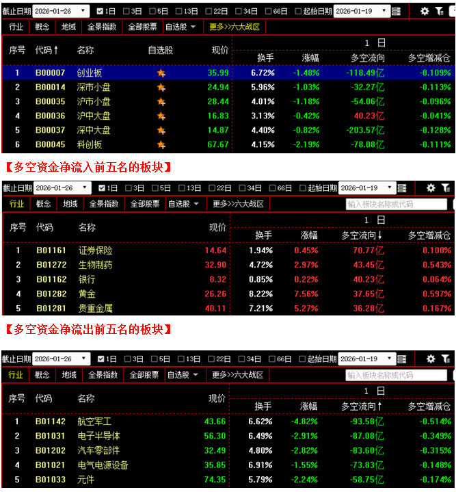从板块资金动向数据来看,截止到今日收盘时,在资金流入榜上,证券保险板块以70.77亿的资金流入额位居榜首;其次是生物制药板块,资金流入43.45亿;此外,银行板块、黄金板块、贵重金属板块的资金流入额也都相对较多,分列资金流入榜第三到第五名位置;再看资金流出榜,航空军工板块引领做空,资金流出93.58亿;其次是电子半导体板块,资金流出87.08亿;此外,汽车零部件板块、电气电源设备板块、元件板块也都相继上榜,三个板块的资金流出额分别为83.60亿、73.83亿、58.75亿。综合比较后可知,今日虽然证券保险板块资金流入超过70亿,同时生物制药、银行、黄金、贵重金属等板块的资金流入额也都在35亿之上,但科技类板块却出现集体退潮,其中不仅航空军工板块资金流出高达93亿,电子半导体、汽车零部件、电气电源设备、元件等板块的资金流出额也均超过了58亿,场内抛压明显增强,从而抵消了多方的上攻力量,导致投资者的总体做多热情有所下降。从六大战区的情况分别来看,截止到今日收盘时,只有沪中大盘战区有40亿资金流入,其余五个战区则均为资金流出状态,其中不仅创业板战区资金流出超过110亿,深中大盘战区的资金流出额更是高达203亿。可见今日尽管有证券保险、银行等权重板块进行护盘,但前期热度较高的科技类板块却出现集体退潮,所以整体上资金以流出为主,空方力量明显强于多方。在这种情况下,即便大盘不会出现大幅回落,但前期涨幅过大的个股一旦出现连续杀跌,也会给持有相关个股的投资者带来巨大损失。故此建议大家密切关注手中个股所处的位置以及资金进出变化,若个股处于历史高位,且资金在高位开始出现连续流出,导致股价短期趋势发生转向,则需及时降低仓位,以避免损失进一步扩大;反之,如果股价处于较低位置,且资金仍在持续流入,则可逢低逐步吸纳。