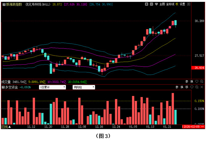 今日两市上涨个股共1604只,其中涨幅超过3%的个股474只,涨幅在9.9%以上的个股105只;下跌个股共3771只,其中跌幅超过3%的个股1371只,跌幅在9.9%以上的个股74只。图3所示为指南针特有的0Z指数K线图,从图中可以看到,今日0Z指数不仅收盘位置重新回到优化布林上紫线下方,而且还将上周五的阳线完全吞没。可见今日场内多数个股都出现了明显下挫,好在虽然0Z指数回落幅度较大,但依然明显高于优化布林中轨,市场整体走势仍处在强势格局当中。从下方的多空资金来看,今日多空资金为流出状态,不过资金流出量远远小于上周五的资金流入量,更无法与之前三个交易日的资金流入总量相比,说明尽管今日场内出现抛压,但市场的短期主动权还在多方手中。在这种情况下,建议大家在控制好仓位的同时,密切关注多空资金的进出情况,若接下来多方及时发力,快速化解掉短期抛压,后市行情就有望在资金的推动下继续向上攀升;反之,如果多方后续无力,空方连续施压,0Z指数就会有回探优化布林中轨的可能。