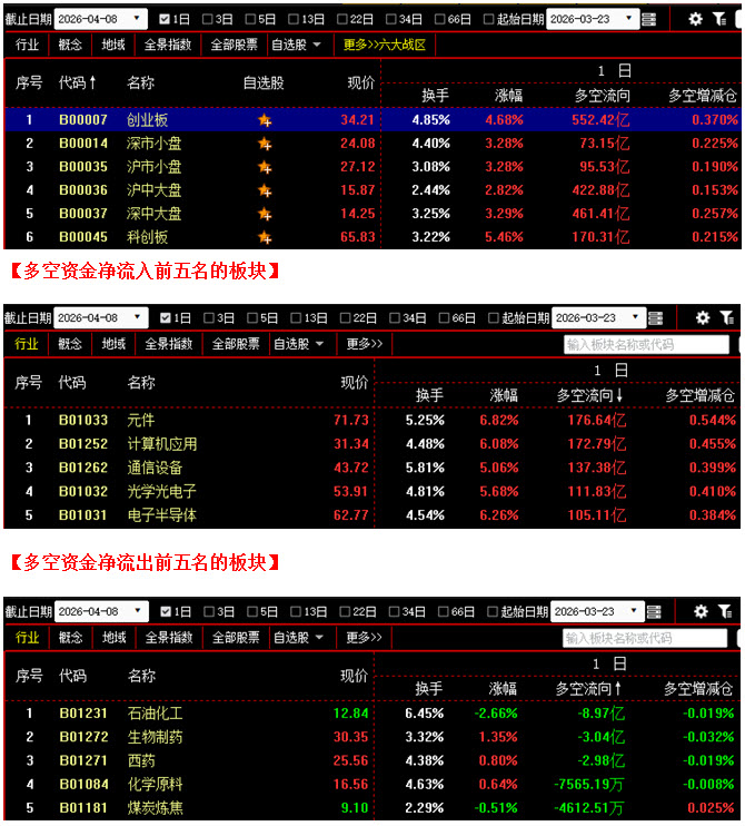 从板块资金动向数据来看,截止到今日收盘时,在资金流入榜上,元件板块以176.64亿的资金流入额位居榜首;其次是计算机应用板块,资金流入172.79亿;此外,通信设备板块、光学光电子板块、电子半导体板块也都相继上榜,三个板块的资金流入额分别为137.38亿、111.83亿、105.11亿;再看资金流出榜,石油化工板块引领做空,资金流出8.97亿;其次是生物制药板块,资金流出3.04亿;此外,西药板块、化学原料板块、煤炭炼焦板块的资金流出额也都相对较多,分列资金流出榜第三到第五名位置。综合比较后可知,今日不仅元件板块与计算机应用板块资金流入双双超过170亿,通信设备、光学光电子、电子半导体等板块的资金流入额也都在100亿之上,科技类板块的集体大幅做多形成了明显的群体上攻效应,带动场内多方人气大幅提升,全天资金流入超过10亿的板块多达34个;反观空方阵营,各板块的资金流出额均不足9亿,与多方力量相比,整体抛压很小。从六大战区的情况分别来看,截止到今日收盘时,六个战区均为资金流入状态,其中不仅沪中大盘战区与深中大盘战区资金流入双双超过420亿,创业板战区的资金流入额更是高达550亿。可见今日各战区均有资金坚决进场加仓,抢筹迹象十分明显,多方力量远远强于空方,具备着压倒性优势,从而推动大盘出现了单日大涨超百点的强力反弹。在这种情况下,短期行情的底部位置就已经基本明朗,接下来只要多方后续资金不断跟上,指数就有望再次突破4000点大关,并进一步向上攀升。建议大家可积极关注前期调整较为充分且近期有资金连续回流的个股,择机介入。