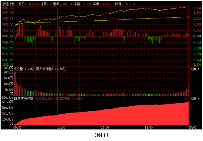 如图1所示,今日早间大盘大幅高开超过40个点,随后指数几乎未做回探,就继续震荡上行,市场重心稳步抬高,午后大盘依然保持强势,指数逐步向4000点整数关口靠拢,最终以3995点收盘。从下方的多空资金来看,早间开盘后,多方就占据优势,随后资金持续大幅流入,空方毫无反击之力。可见今日资金进场十分坚决,多方力量不断增强,具有压倒性优势,使得行情的短期走势出现了关键性转折。在这种情况下,即便大盘无法立即突破4000点大关,市场还会有所反复,但在如此大量资金的支撑下,指数再次下探的幅度将十分有限。故此建议大家积极关注今日资金率先大幅回流的板块,并在其中优选个股,逢低吸纳。