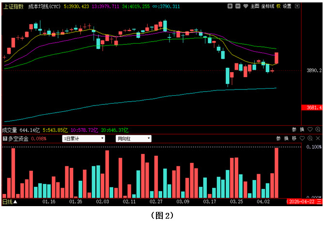 再看图2,今日大盘不仅以高开方式直接站上5日成本均线,而且指数经过拉升后,还跃过了13日成本均线,最终大涨超过百点,收盘位置距离4000点整数关口已近在咫尺,市场短期走势快速转强。从下方的多空资金来看,今日多空资金为流入状态,且资金流入量明显明显高于昨日,说明近两日资金不仅持续进场加仓,而且资金进场的力度正在快速增强,抢筹迹象越发明显,这对于市场进一步向上回升无疑十分有利。不过需要注意的是,虽然今日大盘强力反弹超过百点,但目前指数仍位于2月3日低点的下方,且34日成本均线经过逐日下移后也已经回落至4019点,这就意味着在4000点附近,存在着多重阻力,接下来多方若无法快速穿越上方的密集阻力带,市场在4000点下方就很可能还会出现反复。故此建议大家密切关注多方后续力量的跟进情况以及4000点至4020点区间对指数的压制情况,以便及时掌握行情变化,并做出相应决策。