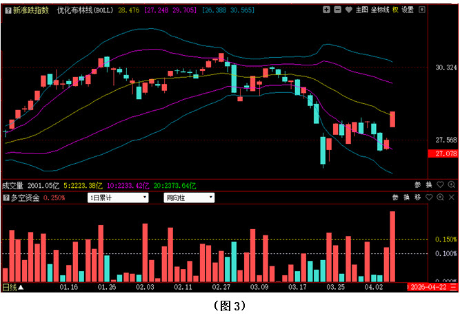 今日两市上涨个股共4878只,其中涨幅超过3%的个股3176只,涨幅在9.9%以上的个股235只;下跌个股共293只,其中跌幅超过3%的个股97只,跌幅在9.9%以上的个股8只。图3所示为指南针特有的0Z指数K线图,从图中可以看到,今日0Z指数同样高开高走,出现强力反弹,收盘位置重新回到优化布林中轨上方。可见今日场内多数个股都出现了大幅上涨,市场整体走势快速好转。从下方的多空资金来看,今天多空资金为流入状态,且资金流入量远远大于昨日,说明多方不仅连续发力反击,且资金进场的力度十分强悍。在这种情况下,行情在短期内很可能会有进一步上攻的动作。但需要注意的是,0Z指数2月2日的低点与3月4日的低点几乎处在同一水平位置,3月19日跌破该位置后,意味着上方筹码均已被套。所以当0Z指数向上反弹接近该位置时,多方所面临的压力将会骤然增大,若无法形成突破,后市行情仍会出现反复。