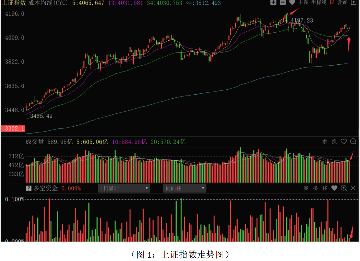 从上证指数来看,股指持续在5日成本均线上方缩量震荡,多空资金净流入202.37亿元,主力资金有一定的逢低进场动作。板块结构上,电子半导体、光学光电子、元件等科技成长板块较为活跃,白酒、黄金、基建等传统行业走势较弱。科技制造板块走强的逻辑,一方面是产业景气度得到业绩的验证,AI产业链从“题材概念”进入“业绩兑现”阶段,尤其是算力、存储芯片、PCB等细分领域龙头盈利超预期。另一方面,海外科技股映射,周五隔夜美股英特大涨,对芯片等板块形成明显的提振,加上DeepSeek-V4正式上线发布,推动国产芯片生态进一步完善,说明国产芯片产业链商业化加速,市场表现出较强的结构性机会。不过,业绩演绎和消息驱动,主要集中在科技成长板块上,消费、基建、白酒等传统行业资金短期操作仍然不积极,可以看出在经济总体稳定增长背后行业的结构性分化。目前成交量总体萎缩,“五一”假期临近,资金整体做多积极性难以大幅提升。同时,美伊谈判处于持续拉扯阶段,小长假期间中东局势演绎的不确定会制约资金的追涨意愿。按照惯例安排,本周会召开中央政治局会议判断下半年经济形势,以及部署稳经济政策,在政策对经济的托底预期较强的背景下,市场整体走势以稳定为主,能否向上突破一方面要看中东局势出现积极信号,另一方面稳经济政策对消费、投资等方向的进一步加强。“五一”假期临近,叠加年报、一季报的业绩集中释放,短期部分个股仍有业绩风险释放的空间,资金的风险偏好可能会收敛,股指短线仍以区间震荡走势为主。技术上,短期成本均线在4030-4060点一带有较强的支撑,前期高点和筹码密集峰位置有较强的压力(4130—4200点)。从0Z指数走势来看,股指回探中、短期成本均线之后强势上涨,全市场上涨个股家数稍多于下跌个股家数,整体赚钱机会没有大幅扩散,多空资金净流入594亿元,对比上海市场的资金流向来看,主力资金对科技成长中小市值品种操作相对积极。波段结构牛指标显示,熊股比例连续调整之后继续向上,马股数量连续抬升后持续向下运行,牛股数量持续上升后开始走平,市场整体赚钱效应没有大幅抬升。节前操作上应采取稳健策略应对,总仓位控制在6成左右,底仓持股为主;短线仓位不宜激进操作,低吸为主,部分品种应趁反弹根据关键位置资金流向和短线决策信号做好仓位调整。
